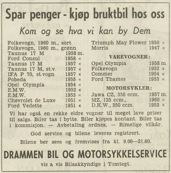 Her ses et par av Folkevognene annonsert til salgs i Drammens Tidende. Legg merke til spenstig åpningstid i forretningen