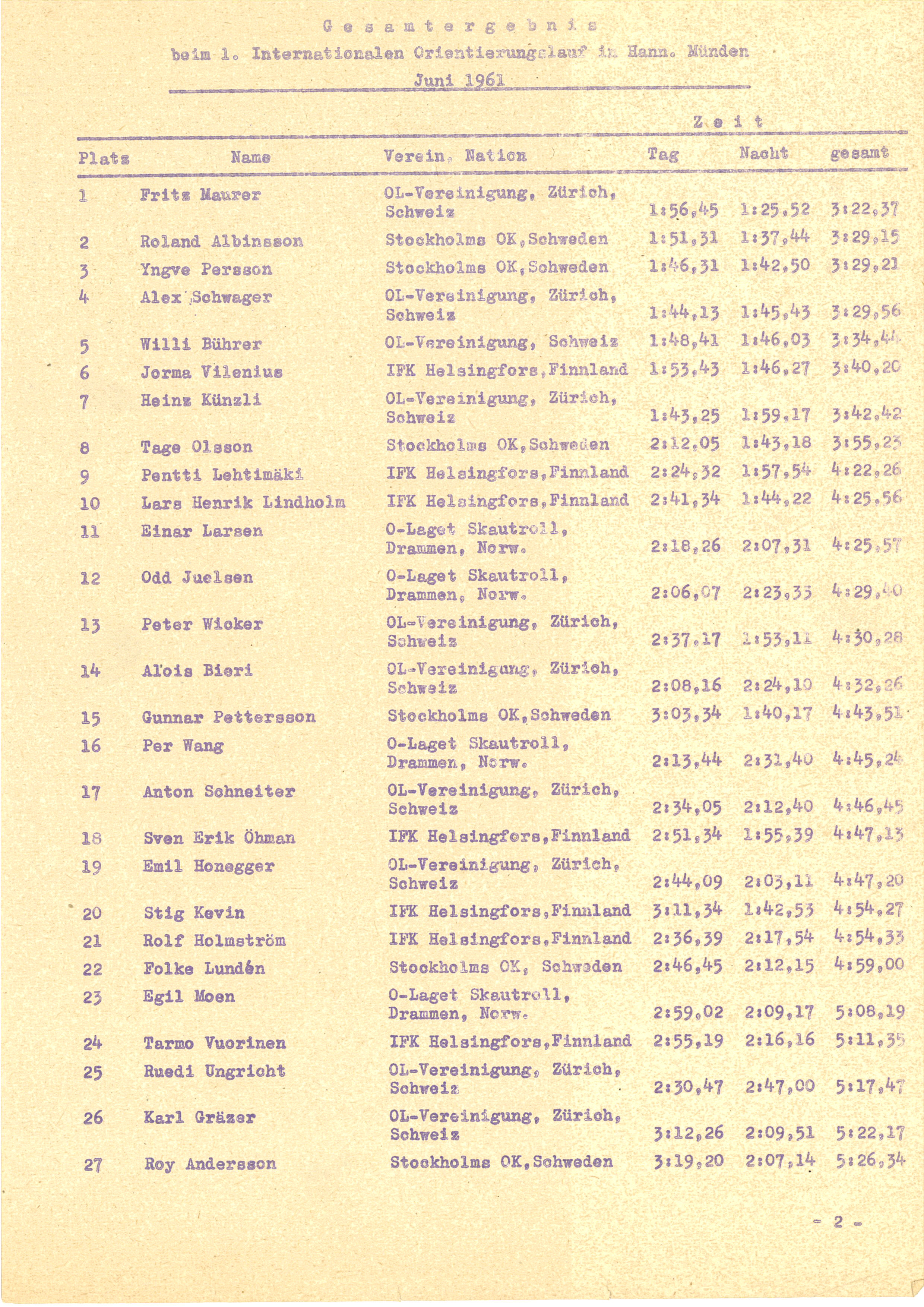 Tirsdag kveld var det fortsatt varmt da løperne gjorde seg klare, men øs pøs regnvær. Enda ei mil skulle tilbakelegges. En tysk avis kunne i sine referater melde at de forventningsfulle løperne så ut som en gjeng fra en annen planet. Å ha tilfredsstillende lys var viktig i nattorientering da som nå. Kreativiteten var stor, det var spenn fra lommelykter til forskjellige arrangementer på brystet og mange ulike versjoner av hodelamper. Mest imponerende skal Skautroll-løperen Tor Wangs lys-løsning ha vært. Han hadde på et vis klart å feste ei motorsykkel-lykt på brystet, på ryggen hadde han et ganske stort batteri i en sekk. Neppe behagelig å løpe med, men det var godt nok til å komme i mål etter en tur på 2.12,29 og bli nr 24, nesten timen bak sveitseren Fritz Maurer som vant på 1.25,52. Beste norske ble Kjell Enger på ellevte plass med tiden 1.52,47. For at det ikke skulle fristes med å løpe i følge var det mange minutters startintervall. Derfor tok det lang tid å få alle ut i løypa og det var folk i skauen det meste av natten.