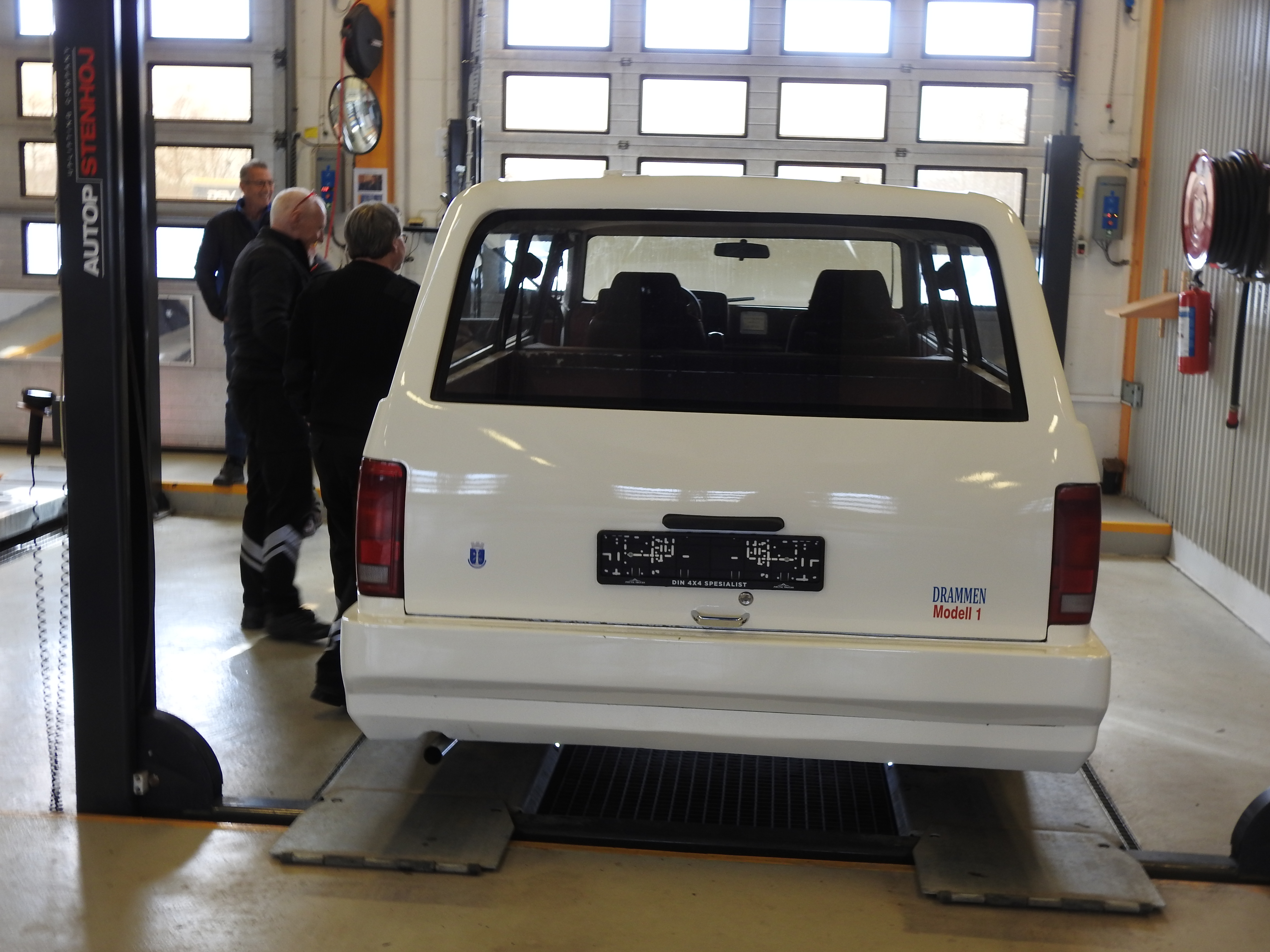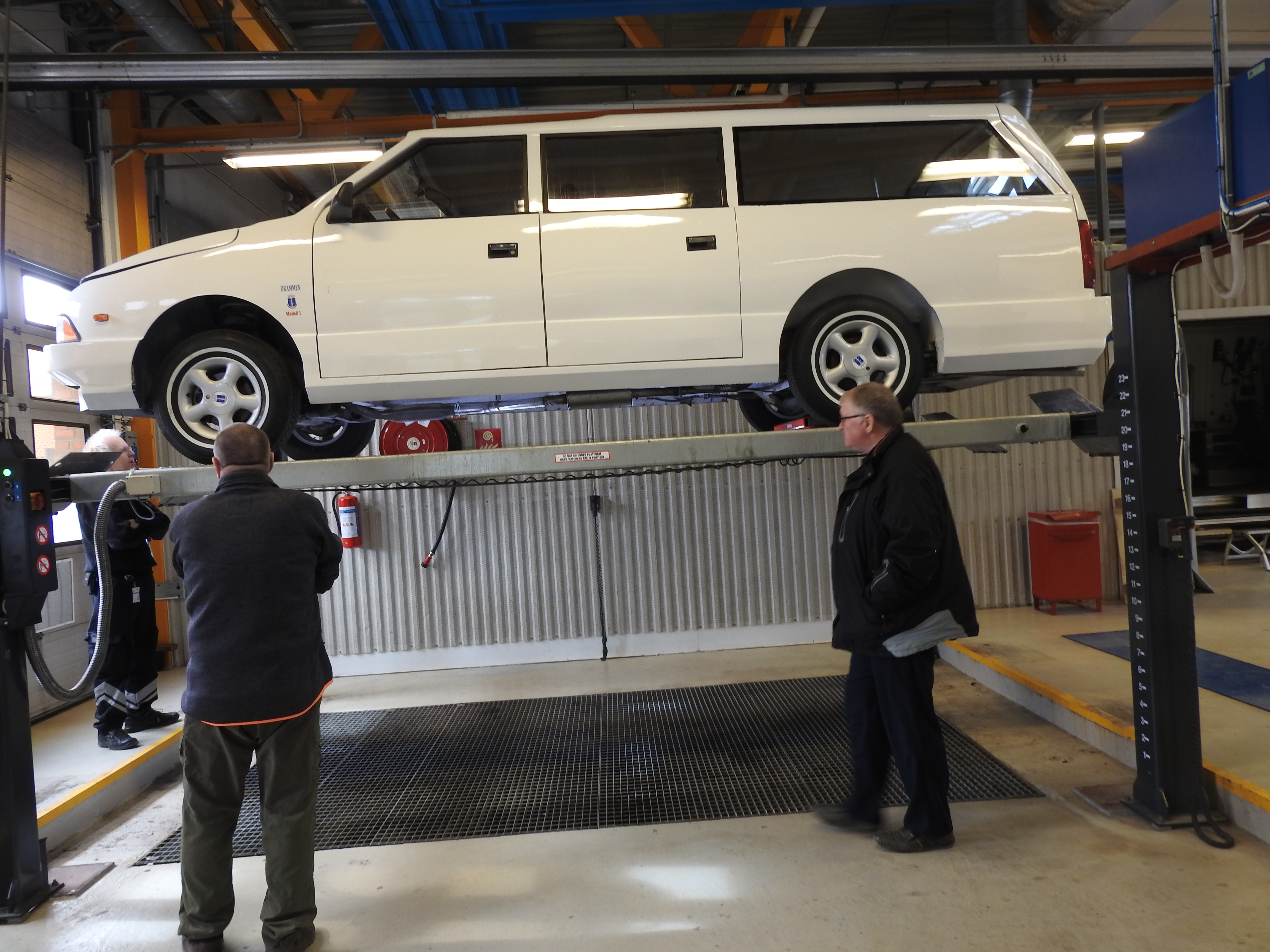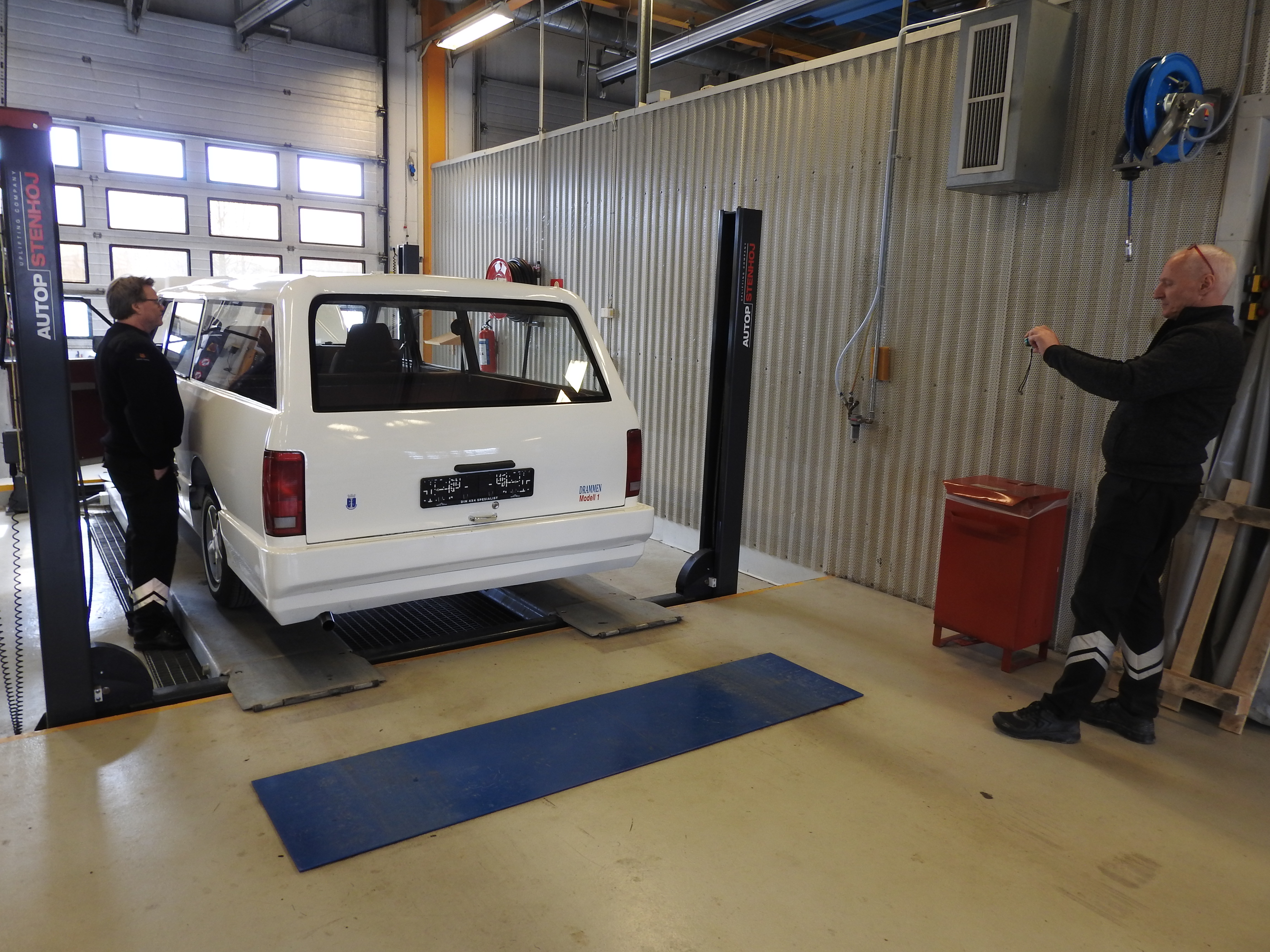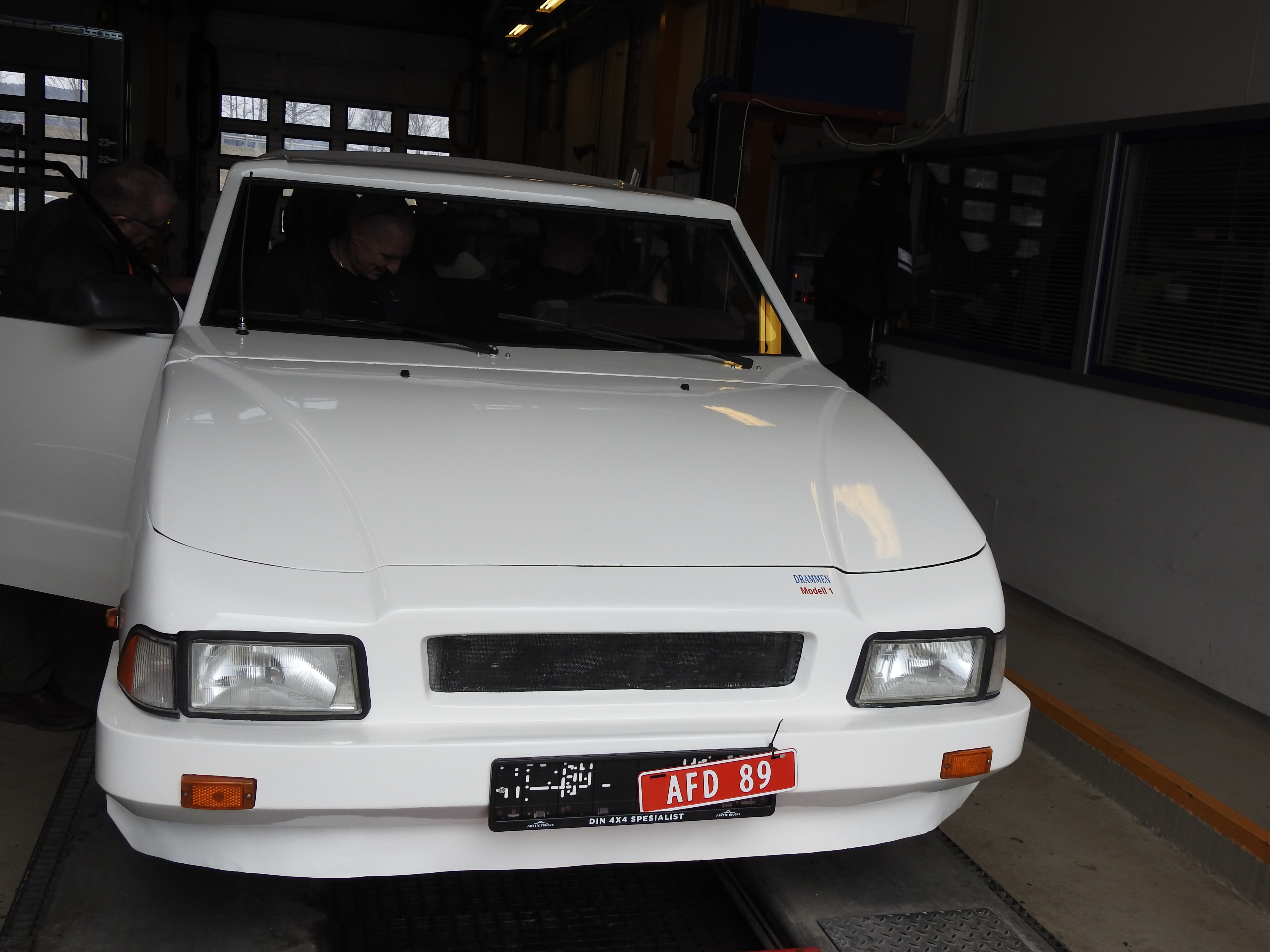 Vel ankommet Drammen Trafikkstasjon var spenningen høy. Kvarteret vi var for tidlig ute gikk kjempesakte, men til avtalt tid gikk porten i kontrollhallen opp og vi kjørte inn. Stemningen var munter og avslappet og de myndige kontrollører gikk løs på oppgaven. Med skarpe blikk, fotoapparat og notatblokk. Om denne bilen noen gang ville få skilter var ingen sikre på, men etter hvert som det skred framover skjønte man at her var det håp. Ganske spesielt å se bilen rulle av sted med to erfarne biltilsynsmenn om bord. Enda mer spesielt var det da de etter en lang prøvetur kjørte inn i hallen igjen. Smilende. Bilen er absolutt kjørbar ble det sagt. Det ble påpekt en del mindre forhold som må utbedres. Som ujevne bremser bak, et kranglete speedometer og slike småting, men konklusjonen ble at skilter skulle Drammensbilen få. For aller første gang. Noen timers dugnadsarbeid og en etterkontroll var et resultat man absolutt var fornøyd med. Ved avreise trafikkstasjonen fikk man beskjed om at bilen gjerne måtte kjøres på prøveskilter.