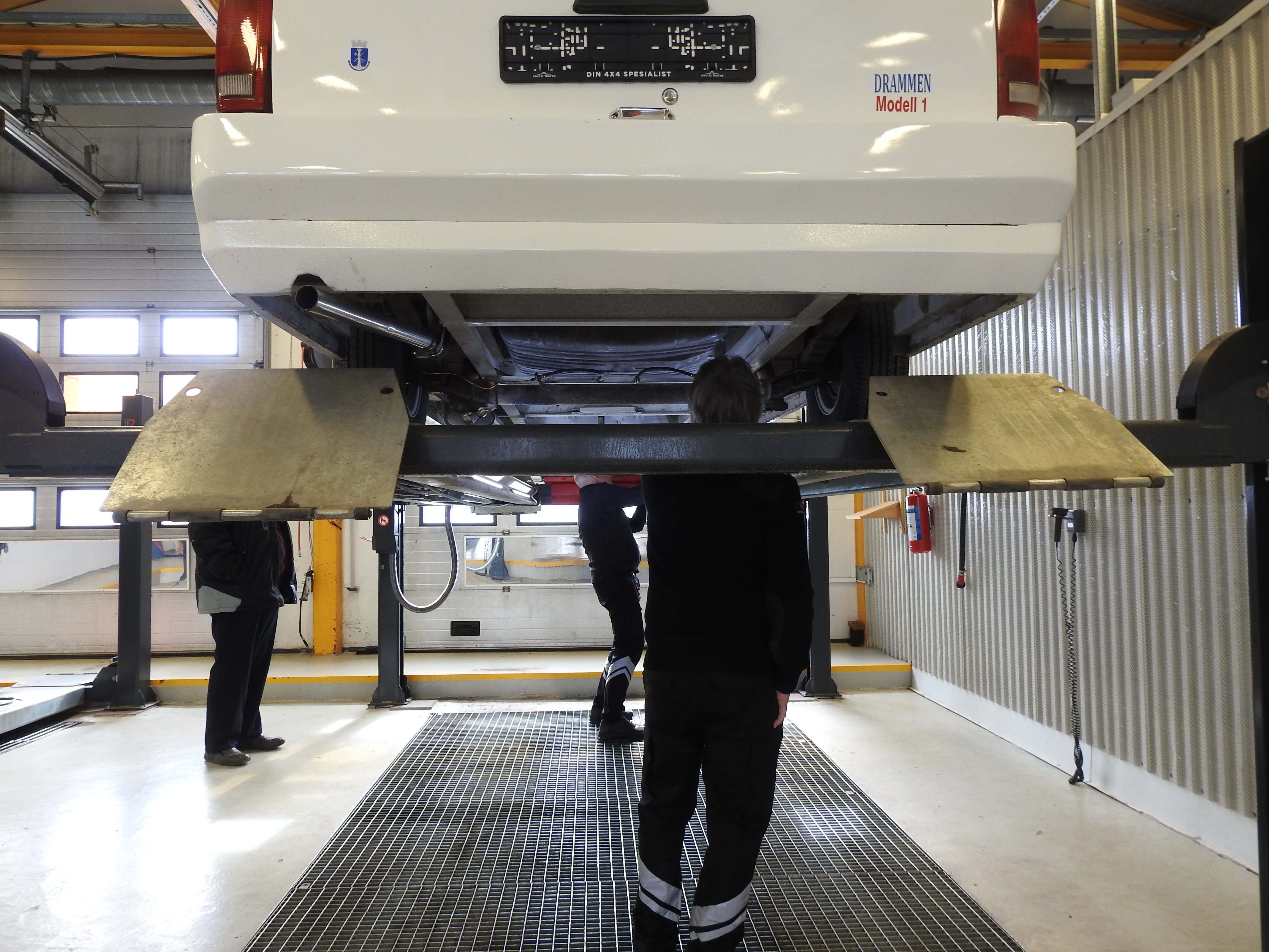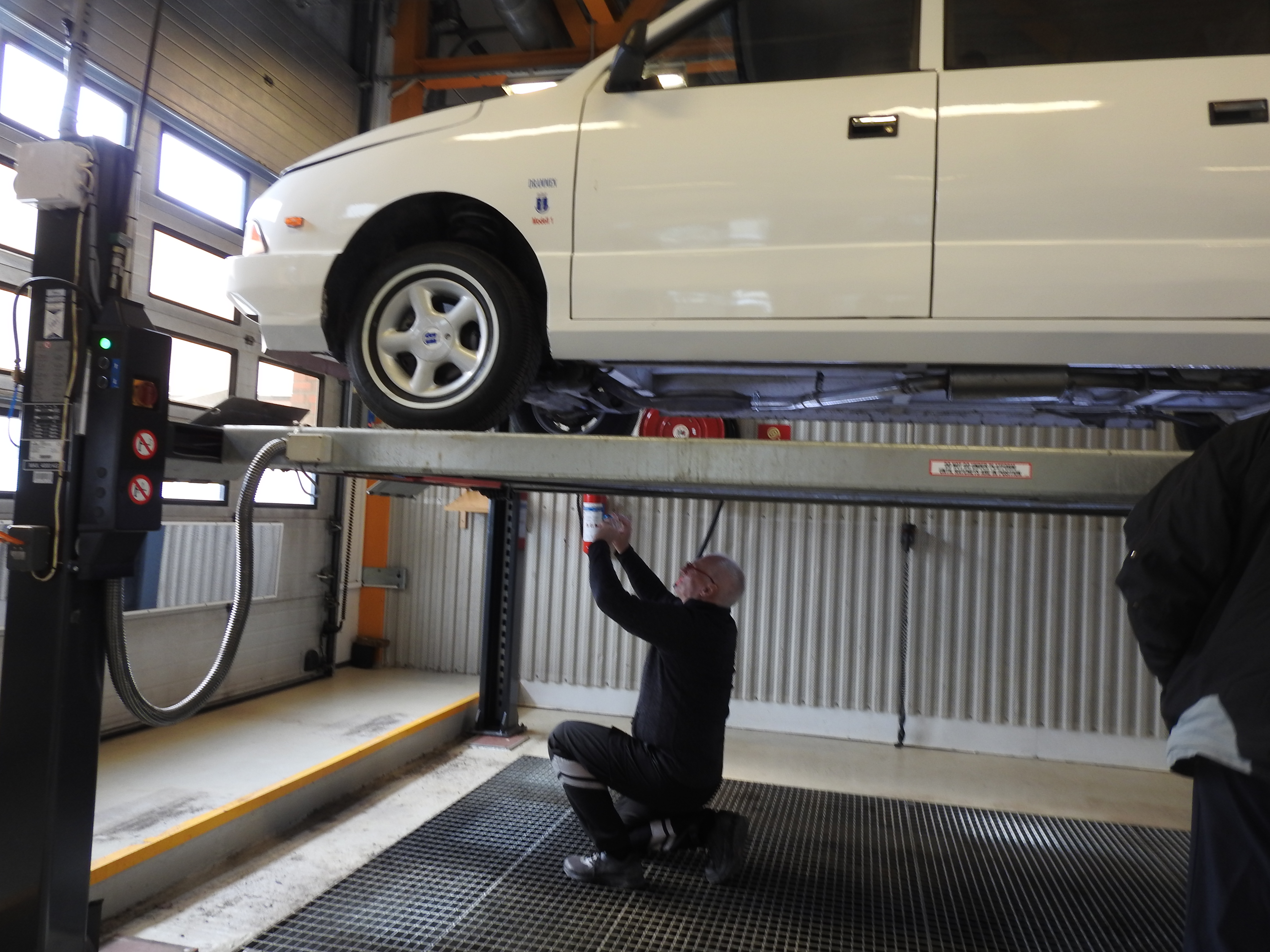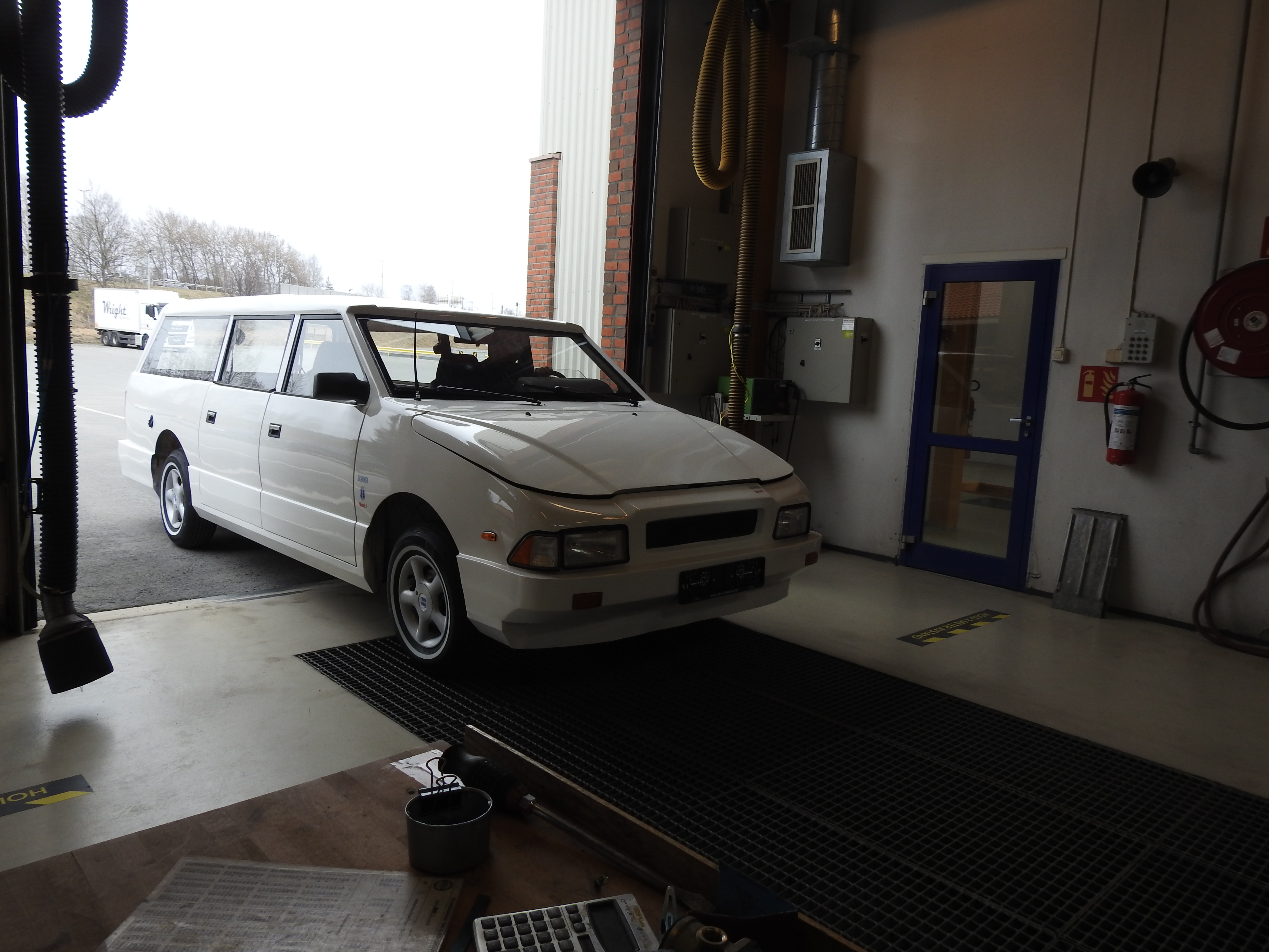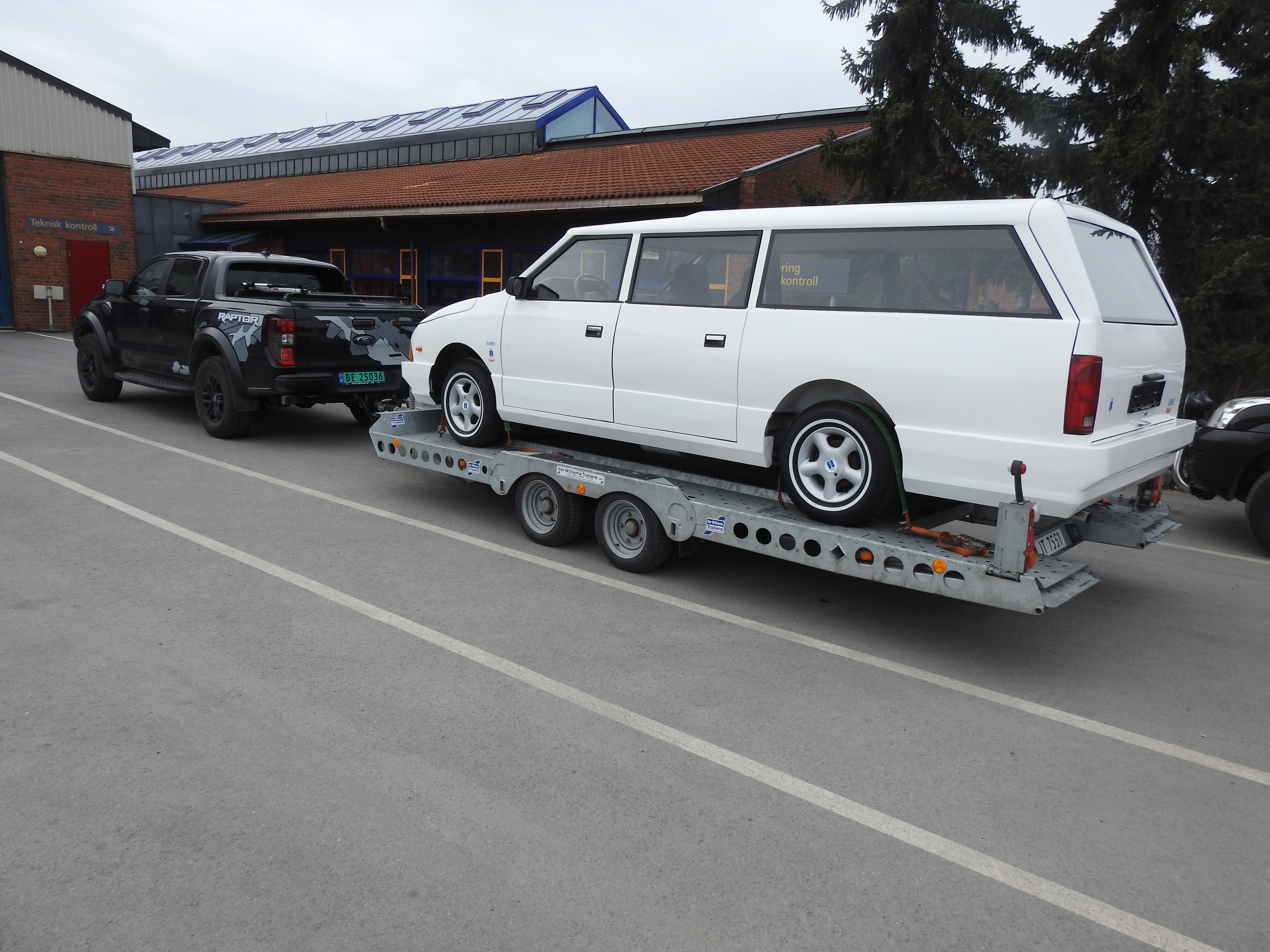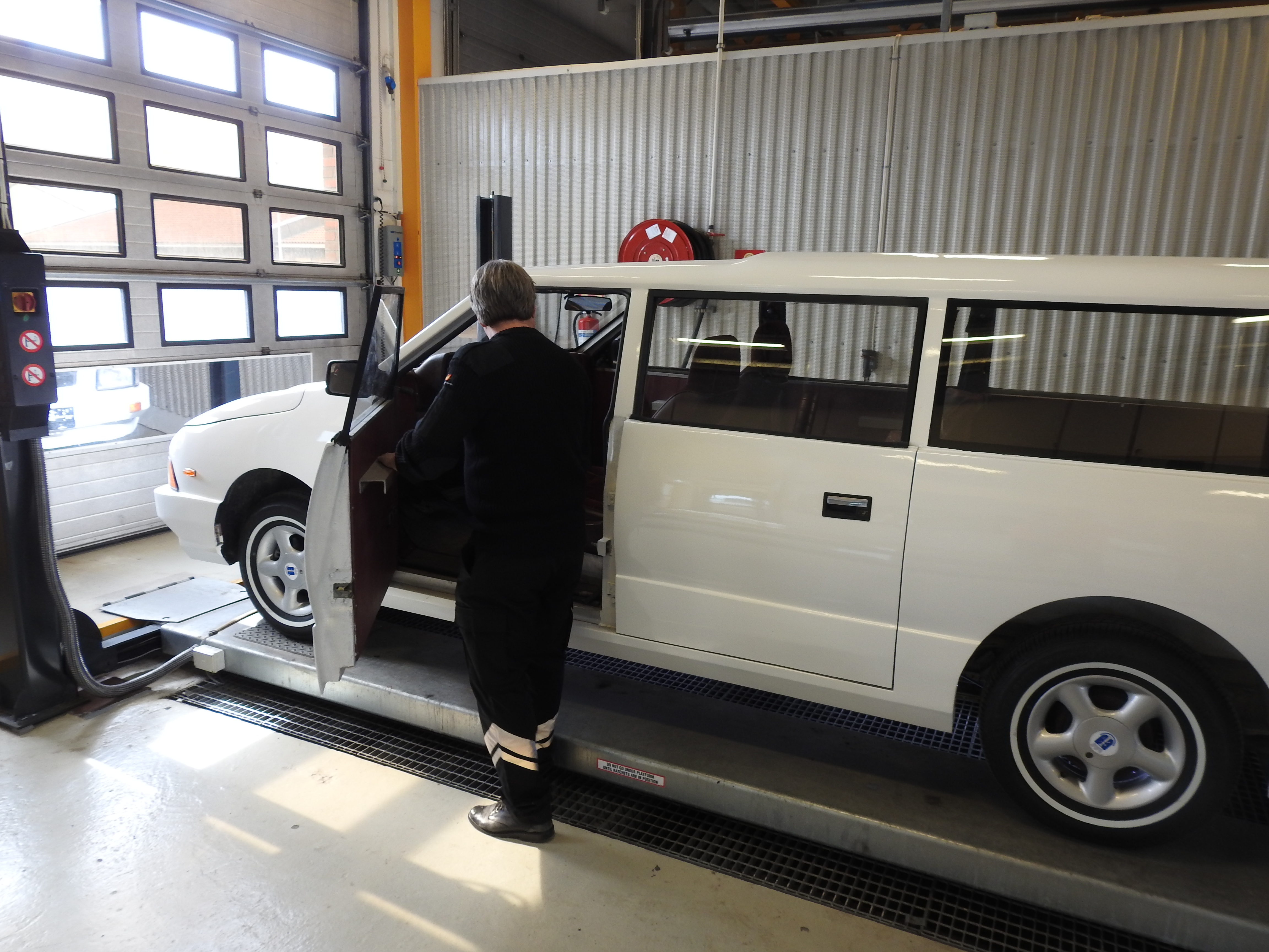 Vel ankommet Drammen Trafikkstasjon var spenningen høy. Kvarteret vi var for tidlig ute gikk kjempesakte, men til avtalt tid gikk porten i kontrollhallen opp og vi kjørte inn. Stemningen var munter og avslappet og de myndige kontrollører gikk løs på oppgaven. Med skarpe blikk, fotoapparat og notatblokk. Om denne bilen noen gang ville få skilter var ingen sikre på, men etter hvert som det skred framover skjønte man at her var det håp. Ganske spesielt å se bilen rulle av sted med to erfarne biltilsynsmenn om bord. Enda mer spesielt var det da de etter en lang prøvetur kjørte inn i hallen igjen. Smilende. Bilen er absolutt kjørbar ble det sagt. Det ble påpekt en del mindre forhold som må utbedres. Som ujevne bremser bak, et kranglete speedometer og slike småting, men konklusjonen ble at skilter skulle Drammensbilen få. For aller første gang. Noen timers dugnadsarbeid og en etterkontroll var et resultat man absolutt var fornøyd med. Ved avreise trafikkstasjonen fikk man beskjed om at bilen gjerne måtte kjøres på prøveskilter.