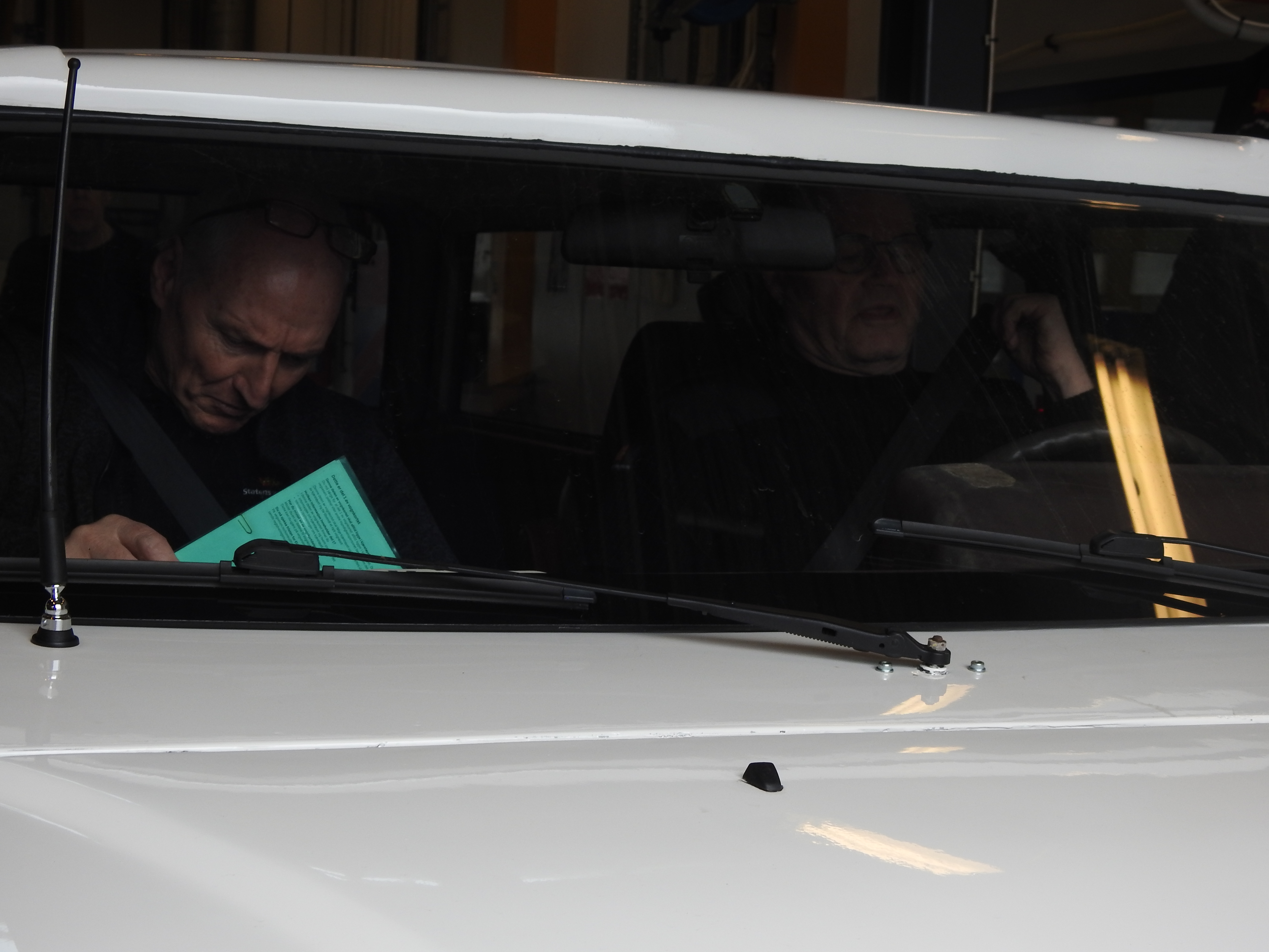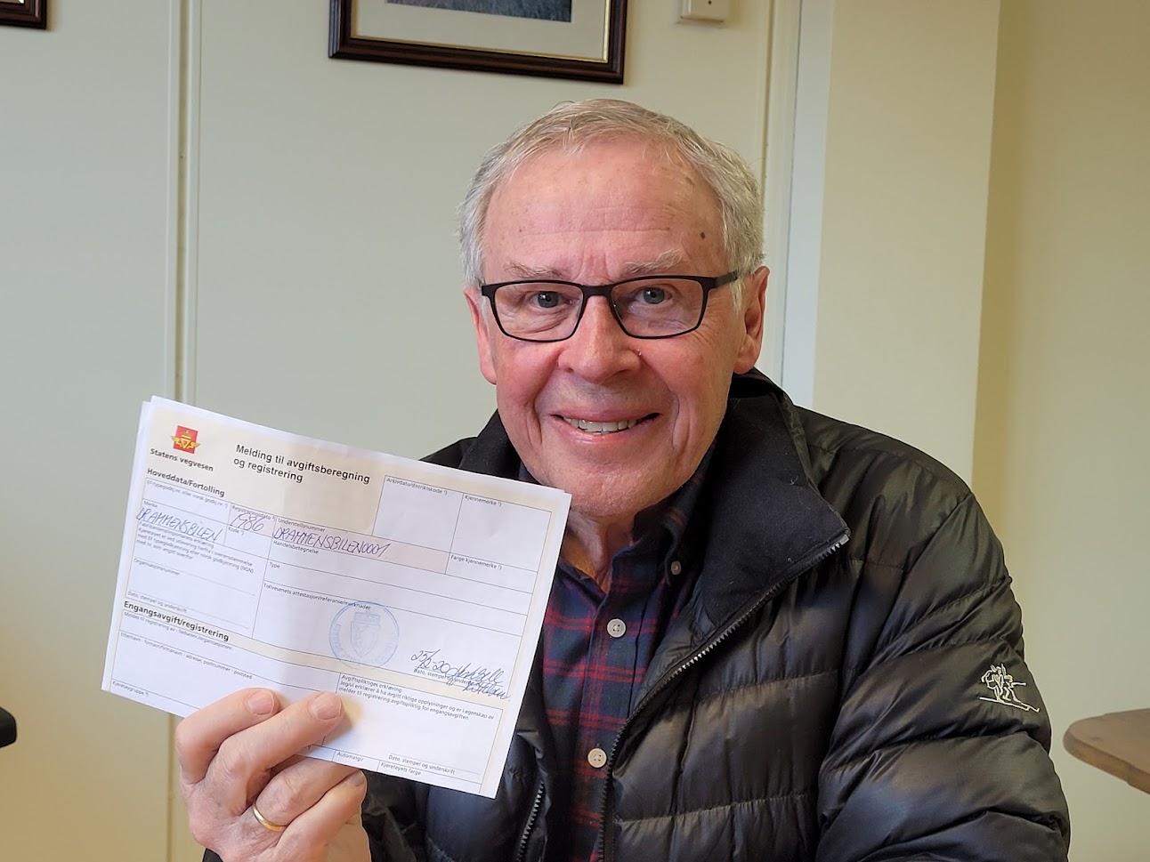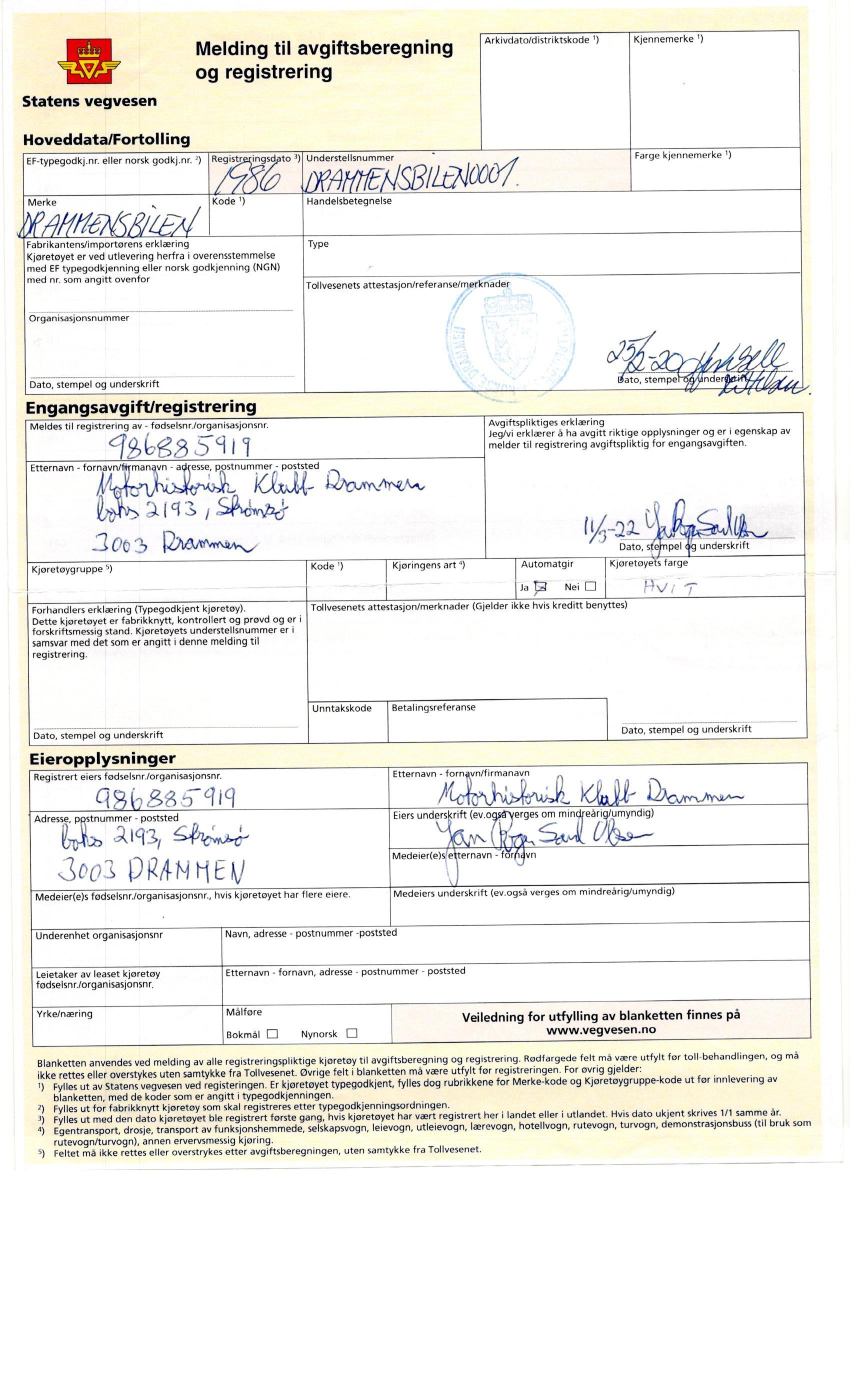 Norsk Bilproduksjons Model 1 har aldri vært registrert. Det måtte det gjøres noe med og søknader ble sendt til Vegdirektoratet. Med attest fra LMK om at bilen bør kunne registreres på historisk interessant grunnlag, var spenningen stor på hva svaret skulle bli. Svaret ble positivt og plutselig satt vi med registeringskort fra Toll og Avgift. Hva vi før kalte tollkort. På verdens eneste Drammensbil. Verdens kuleste bilsakkyndige, Erland Weberg og Runar Støleggen på trafikkstasjonen i Drammen har underveis kommet med råd, og lurt på om vi ikke snart ble ferdige. Førstnevnte rakk faktisk å pensjonere seg før vi rulla inn for kontroll. Han ble erstattet av Pål Erik Westeng. Men nu, nu var den store dagen der.