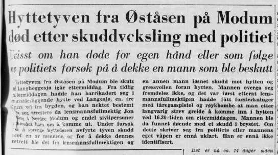 I løpet av livet kommer vi alle borti saker vi helst skulle sett aldri hadde skjedd. Er du politimann er selvfølgelig sjansen for å komme ut for alvorlige episoder langt større enn for den vanlige mann i gata. I juli 1953 kom det inn melding om hytteinnbrudd på Øståsen på Modum. Ikke bare var det innbrudd, men innpå skauen befant seg en truende og bevæpnet kar. Selvsagt måtte hytteeiere og den øvrige befolkning beskyttes. Ensom lensmannsbetjent på et slikt oppdrag var ikke forsvarlig og bistand fra Hønefoss eller andre politienheter ville ta for lang tid. Ut fra dagens politifaglige vurderinger ville nok den valgte løsningen ikke vært akseptabel. Men det var en helt annen tid. I mangel av bistand fikk man med seg to bevæpnede sivilister til skogs. På jakt etter det som skulle vise seg å være en psykisk ustabil mann som hadde rømt fra Lier Sykehus. Eller Lier-asylet som det het den gang. Mannen ble funnet forskanset inni ei hytte og han ble beordret ut. Det nektet han og det ble blant annet brukt røykgranat for å få ham ut. Det kulminerte med at innbryteren avfyrte skudd gjennom nøkkelhullet på hyttedøra. Ilden ble besvart med skudd lavt på døra med formål å treffe beina.. Det viste seg at den man skulle pågripe satt på huk på innsiden av døra og ble truffet i overkroppen. Dessverre døde han av skaden. Dette var en sak som ble omtalt i alle landets aviser og ble naturlig nok et samtaleemne. Lokalt var støtten til lensmannsbetjenten stor. I en etterfølgende rettsak ble det konkludert med at man hadde handlet i nødverge og alle ble frikjent. Som et bilde på endrede tider er det underlig å lese at lensmann Gundhus under rettssaken ble spurt om hva våpeninstruksen sa om bevæpning av sivile med mer. Til det svarte Gundhus at det visste han ikke. I dag hadde nok et slikt svar ført til et alvorlig lurveleven. I en injuriesak John Wang reiste mot Dagbladet ble det inngått forlik. Ubekreftede muntlige overleveringer i familien har fortalt at lensmannsbetjent John Wang en mørk kveld ble angrepet av noen fra den dreptes familie. Han valgte i følge de samme overleveringene ikke å forfølge saken. Utførlige detaljer rundt denne saken kan også leses bl.a. i «Gamle Modum».