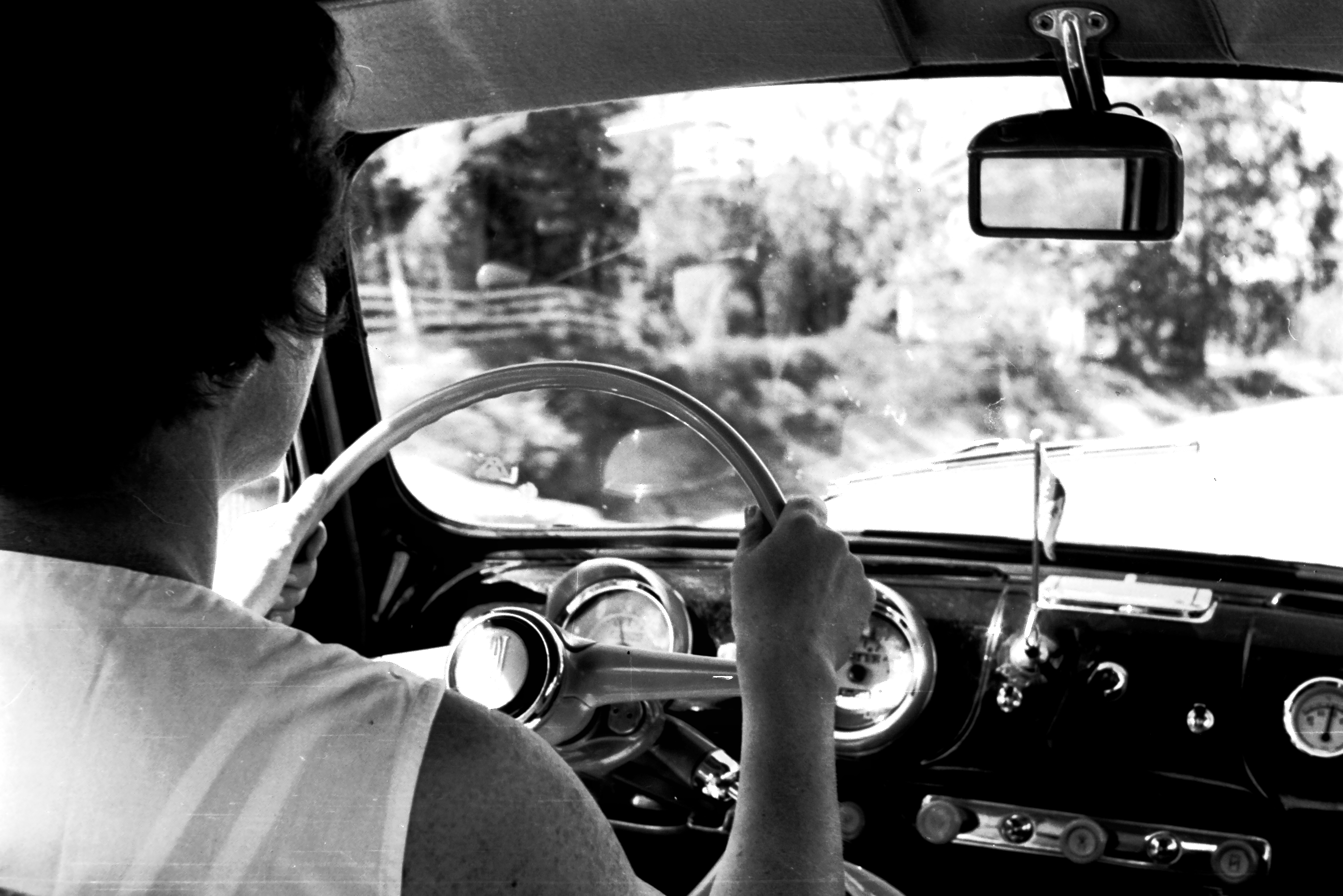 På vei til orienteringsløp i 1956-modell Fiat 1100. Legg merke til Skautroll-flagget på dashbordet. Randi Wang kjører. Foto Per Wang