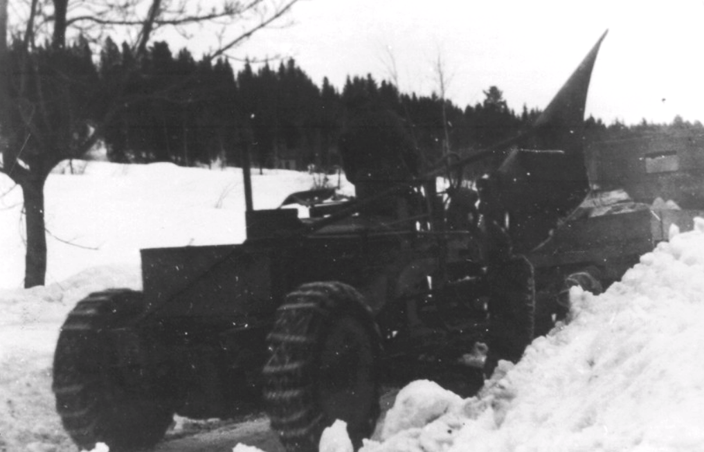 På Stubberud sliter Purka foran og Dravn veghøvel bak. Foto: Skoger og Konnerud Historielag